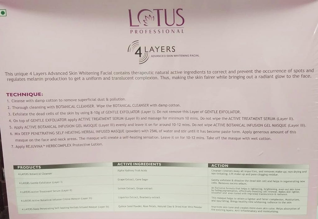 Achieve salon-like glowing and radiant skin at home with the Lotus Professional 4 Layers Advanced Skin Whitening Facial Kit. This advanced facial system is specially formulated with therapeutic botanical ingredients that target pigmentation, dark spots, and uneven skin tone, giving you a brighter and more even complexion.