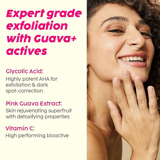 Powered by 3% Glycolic Acid, this lightweight serum removes dead skin cells, unclogs pores, and boosts cell renewal for visibly clearer and more radiant skin. The addition of Guava Extract, rich in antioxidants and natural Vitamin C, helps improve brightness and even out the skin tone.