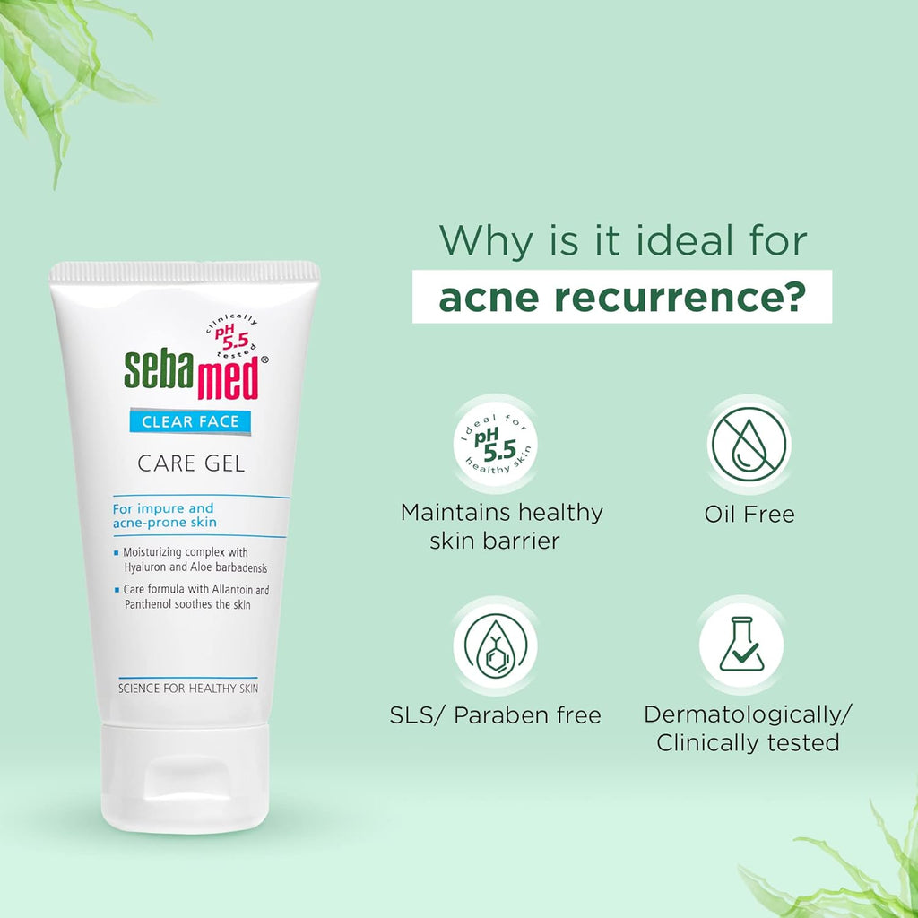 Sebamed Clear Face Care Gel (50 ml) is an oil-free, lightweight gel specially designed for acne-prone, sensitive, and combination skin. Formulated with a skin-friendly pH 5.5, it helps stabilize the natural protective barrier while providing gentle hydration without clogging pores.